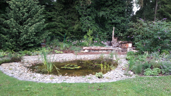 Dann kam Herr Bichlmeier, der 1. Vorsitzende des Gartenbauvereins, dazu und berichtete über die vielen ehrenamtlichen Stunden, in denen der Garten gestaltet worden war: mit Erdbewegungen für die Hütte, den Teich und die Beete, der Beschaffung der Pflanzen (sogar von einem Friedhof in München) und den Plänen für die Zukunft, einem eigenen Schulbeet, der Randbepflanzung und einem weiteren Barfußsektor mit Zapfen.