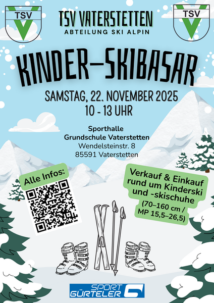 Am Samstag, den 22. November 2025, könnt Ihr Euch von 10 bis 13 Uhr in der Sporthalle der Grundschule Vaterstetten (Wendelsteinstr. 8, 85591 Vaterstetten) mit gebrauchten Kinderski und - skischuhen ausstatten. Dabei könnt Ihr Euch vor Ort durch Mitarbeiter von Sport Gürteler sowie Trainer des TSV Vaterstetten beraten lassen.