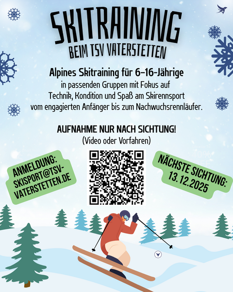 Die Skiabteilung des TSV Vaterstetten startet ab Oktober 2025 wieder mit ihrem beliebten alpinen Skitraining für Kinder und Jugendliche von 6 bis 16 Jahren. In alters- und leistungsgerechten Gruppen fördern wir gezielt Technik, Kondition und Spaß am Skirennsport – vom engagierten Anfänger bis zum Nachwuchsrennläufer.
