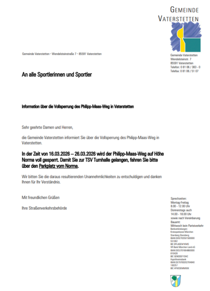 die Gemeinde Vaterstetten informiert über eine Vollsperrung des Philipp-Maas-Weges.