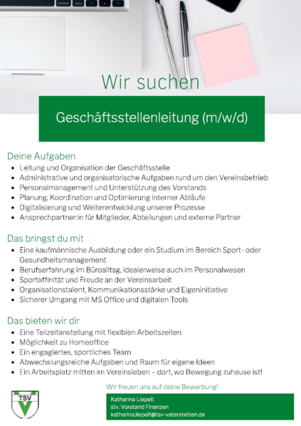 Der TSV sucht eine engagierte Persönlichkeit zur Leitung und Organisation unserer Geschäftsstelle.