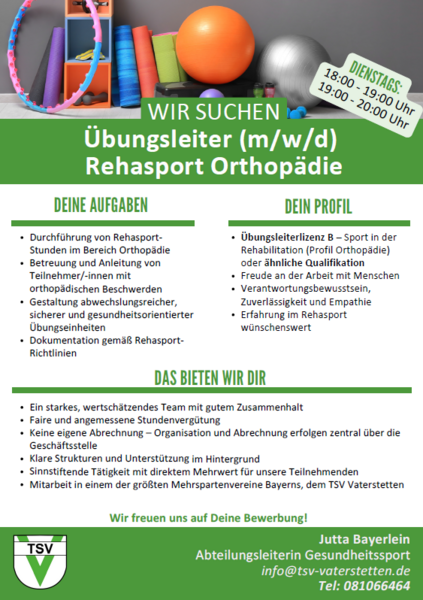 Bei Fragen oder zur Bewerbung wende dich gerne an Jutta Bayerlein (info@tsv-vaterstetten.de) (Tel: 081066464).